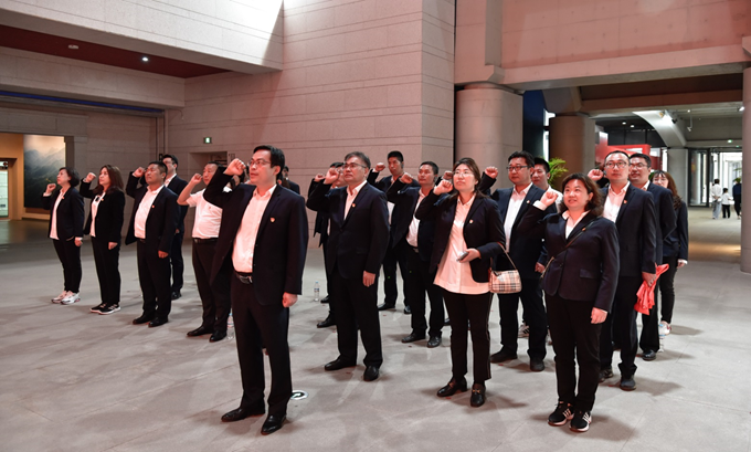 參觀結(jié)束后,全體黨員在紀(jì)念館大廳重溫入黨誓詞,在黨旗下接受心靈的凈化和洗禮。